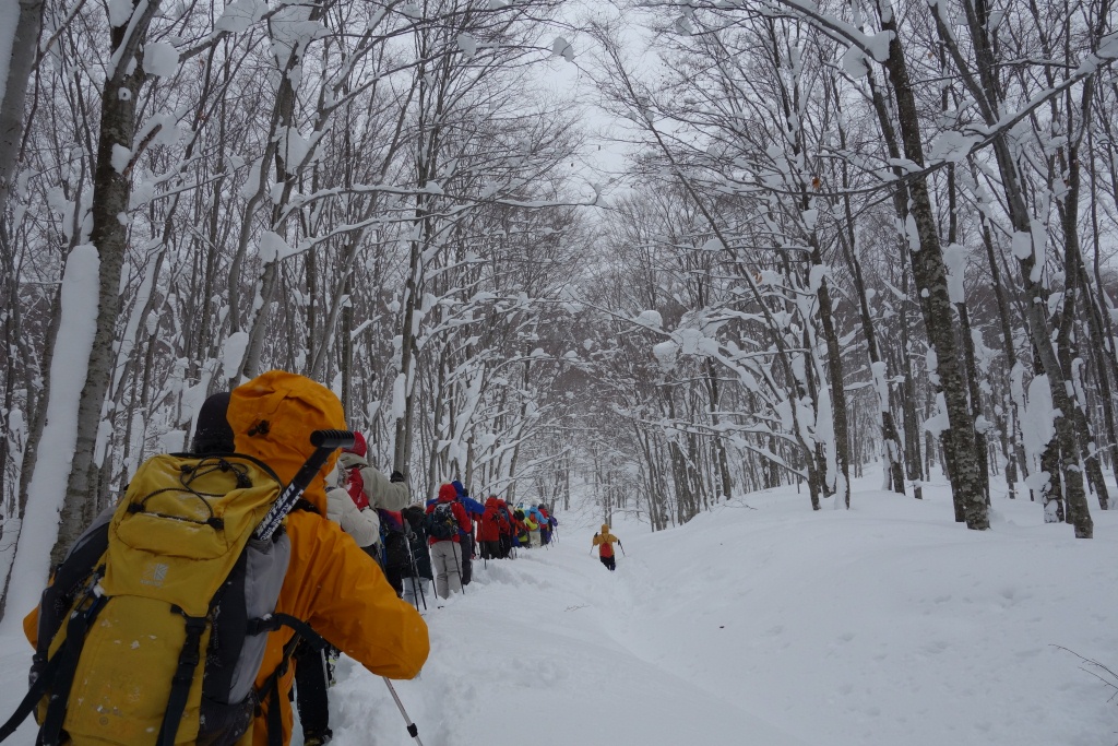 夏には木漏れ日が心地よいブナの回廊、真冬はこんな様子となっています。冬の空吹湿原に向けて、いよいよ出発です。