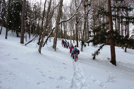 ブナ林がある所まで雪の上を登ります。さすがに登り坂では疲れるのか黙々と歩きます。