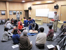 続いて、AED(自動体外式除細動器)を用いた救命講習会を受講しました。万が一に備え、繰り返しの反復練習が重要とのことで、毎年、同講習を受けています。実際にAEDも用いた救命処置の経験者が、参加者のうち、3名もいたことには驚きでした。
