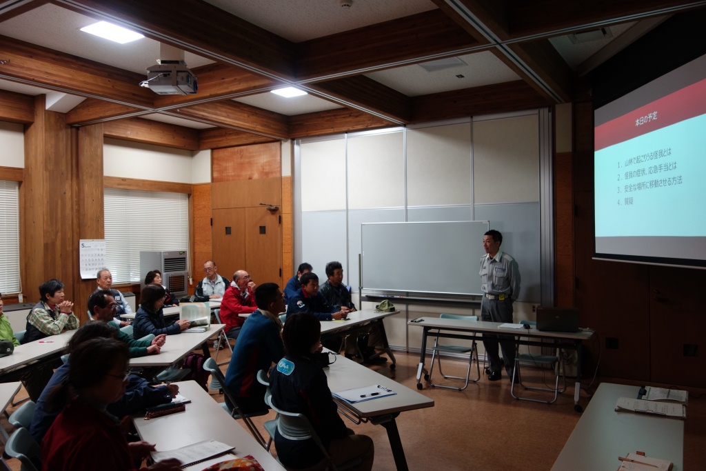 総会前に新人研修会と救命救急研修会を行い、救命救急については鹿角広域行政組合消防署から講師の方をお招きして、実際に八幡平地区で発生した事例の紹介とともにパークボランティアの方々が活動する範囲内で役立つ応急処置等について実演を交えながらご説明いただきました。