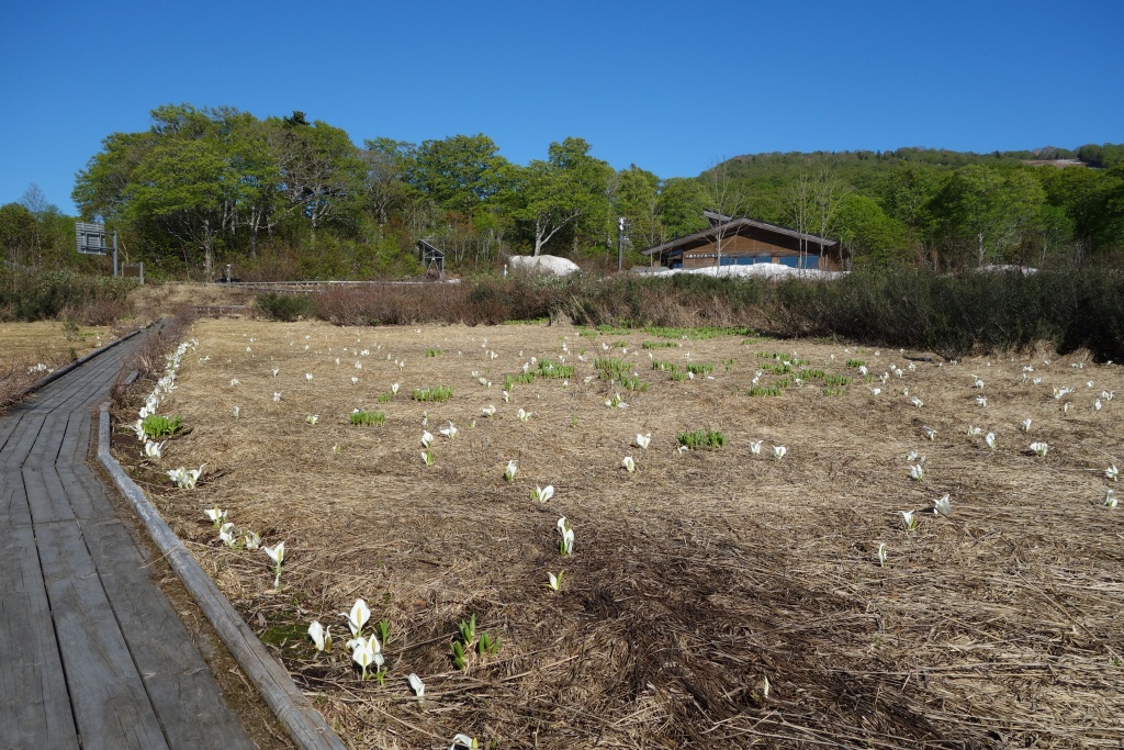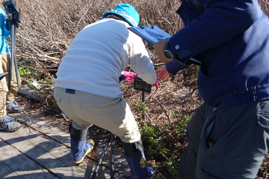 総会後、雪も消えてミズバショウが見頃となっている八幡平ビジターセンター前の大沼周辺散策路で、パークボランティアさんによる樹名板の設置作業が行われました。