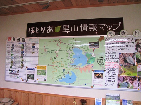 里山情報マップコーナーには、大山上池・下池や隣接する都沢湿地の生き物情報が掲載され、鳥獣保護区管理員さんの巡視時の野鳥情報も提供・掲示されています。職員の方「毎週のように県外から「ほとりあ」へ訪れ、野鳥情報を確認してから下池周辺の野鳥観察に訪れる方もいらっしゃいますよ!」とのことには驚きでした。池や湿地、山に囲まれた多様な環境が、多くの種類の野鳥を観察することに適しているのかもしれません。下池の周囲には散策路があり、1時間余りで散策することもできます。
