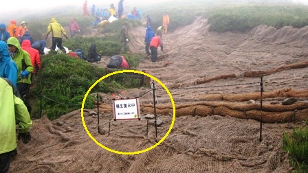 作業地には「植生復元中 通行をご遠慮ください」といった掲示がされています。一部登山道が細くなり、登りと下りのすれ違いの際にご面倒をお掛けしますが、その掲示のある箇所は歩くのを避けて通行いただくようお願いします。