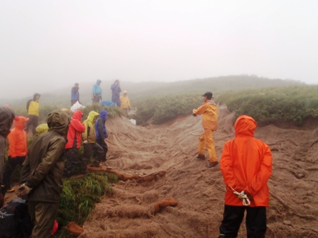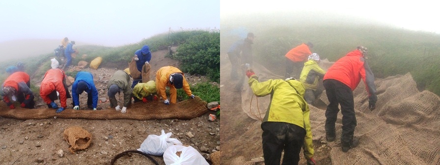 作業は3班に分かれ、計画図と班長らの指示をもとに、各班着々と進みました。本来の自然の復元に向けて、土砂流出抑制・水流速度低減を図るために土留めをつくったり、植生回復のために緑化ネットを敷設したりします。歩行路の作業では、登山者が歩きやすいように何度も何度も歩いて足の置場を確認しながら、土のうを設置するなどの配慮もされています。皆さん、雨降りの中で土砂にまみれながらも、朝日の山を守りたい一心に一生懸命、ですが、とても賑やかに楽しく進みます(もちろん私も)。