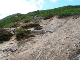 作業地は「銀玉水」という水場の上部、標高約1680m周辺の人為的な影響で荒廃が進行している箇所です。ここは、平成21年設立の当協議会が初めて合同保全作業を実施した箇所でもあります。当時、緑化ネット敷設や分散排水などの作業を行い、一旦は回復した植生も、ネットの消滅や歩行路が再び複線化したことなどにより喪失され始めていました。そこで、再度保全作業を行うことになりました。