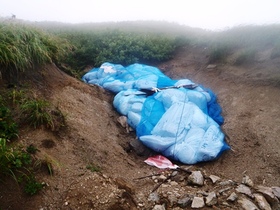 事前の保全資材荷上げ協力の呼び掛けに、何と400㎏弱の資材が人力で作業地へ荷上げされました(毎年恒例の荷上げは通称「荷上げ祭」とも呼ばれ、楽しみ?の一つとなっています)。これも朝日連峰を愛する方々の力です。
