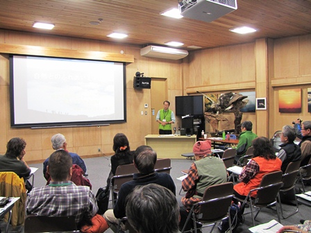 まずは、網張ビジターセンターの大堀拓主任解説員を招き、センターの取り組みや十和田八幡平国立公園八幡平地区パークボランティア(八幡平地区、南八幡平地区、岩手山地区の3地区)の活動紹介などについてお話しいただきました。普段なかなか触れる機会のない他地区の活動状況の紹介に興味津々の様子でした。とはいっても、各地区の特性に合わせた活動内容や組織の運営があるということを、私も含め、みなさん改めて感じているようでした。