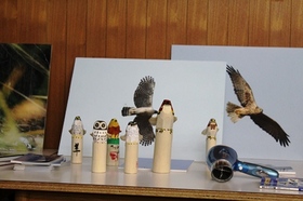 「お鷹ぽっぽ」は山形県米沢市に伝わる木彫玩具です。絵付けでは、タカ型に彫られた木と、図鑑などの写真をじっくり見比べながら、思い思いに絵付けをしました。その中で、猛禽類の目や嘴のつくりや、種によっての違いなど、新しい発見もあったようでした。