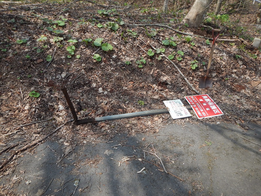 ちょっと見づらい写真ですが、これは十和田湖の生出(おいで)キャンプ場近くにある制札です。雪融けと共に曲がってしまいました。
