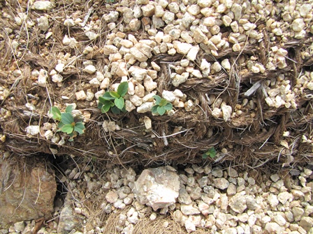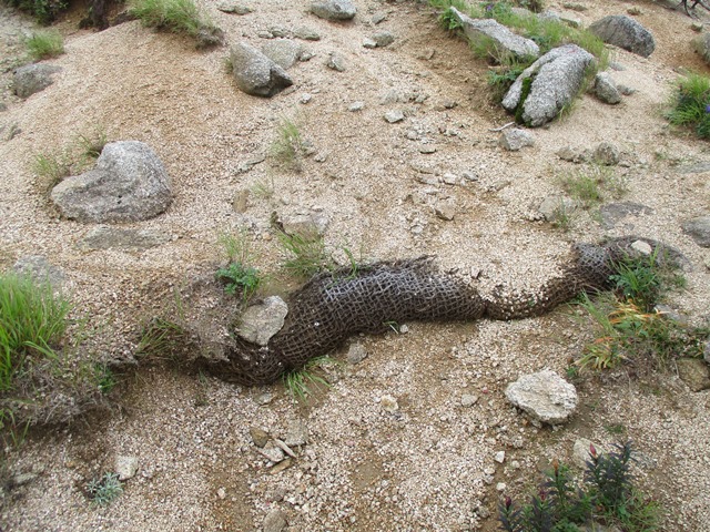 「2年で植物の侵入が見られるのは珍しい」と保全作業の参加者は体を屈ませて観察します。屈み込んで話す様子は明るく和やかで、見ている私も思わず笑顔になりました。土嚢やネットのハンモックをゆりかごに出てきた芽は、笑顔で話しかけられて大切にされています。