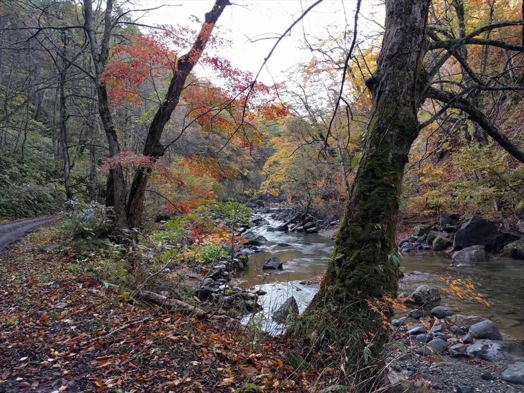 松見の滝までは、黄瀬川沿いの林道歩きがしばらく続きます。まだ紅葉を楽しめます。奥入瀬渓流と違ってこちらは静かです。