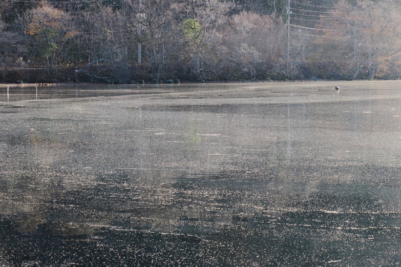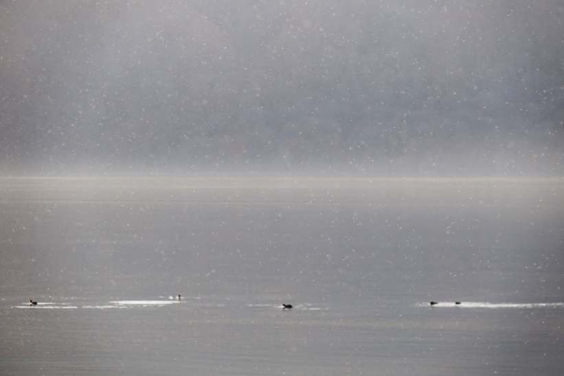 全体的に湖面上がモヤモヤしています。雪が降っているようにも見えます。