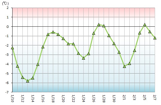 上の図は2017年1月9日から2月8日までの1ヶ月間における日平均気温を、3日間で移動平均した値をプロットしたものです。寒暖のサイクルがよく分かると思います。1月26日まで順調に成長してきた氷柱は、その直後の暖気には耐えたものの、2月5日のピークに耐えきれずに崩落してしまったようです。
