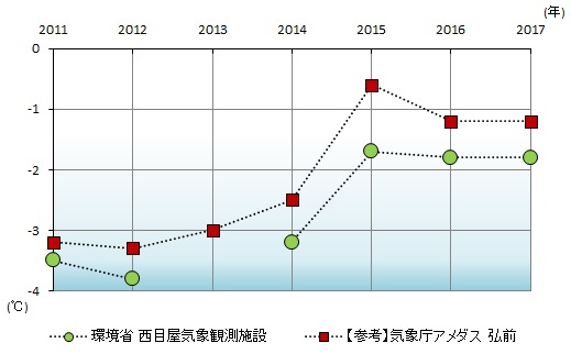 次に、直近7年間の1月の月平均気温をプロットした図を見てみます。2013年の西目屋気象観測施設が欠測でしたので、参考として気象庁アメダスの弘前地点のデータを併せて載せてみました。完全氷結した2012~2014年は-3℃~-4℃の値ですが、2015年以降はやや高い値になっています。2011年は2014年と比べると低い値ですが、氷柱の成長には寒さだけでなく寒暖のタイミングが重要らしいので、寒い方が良いと一概に言うことはできません。