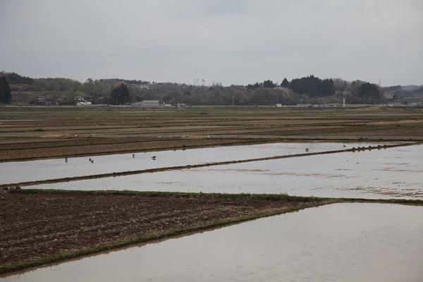 こちらは、田んぼに水を入れだしています。その中にも、マガンがいます。数えると15羽が休んだり、餌を探したりしています。こちらは、北帰行ができないかもしれないグループ、羽根をけがしたか、私たちには見えない傷があるのかもしれません。家族愛の強いマガンは、飛べないマガンに家族が寄り添っているかもしれません。ここで心配なのは、農家さんの田植えの邪魔をするのではないか、心配の種です。