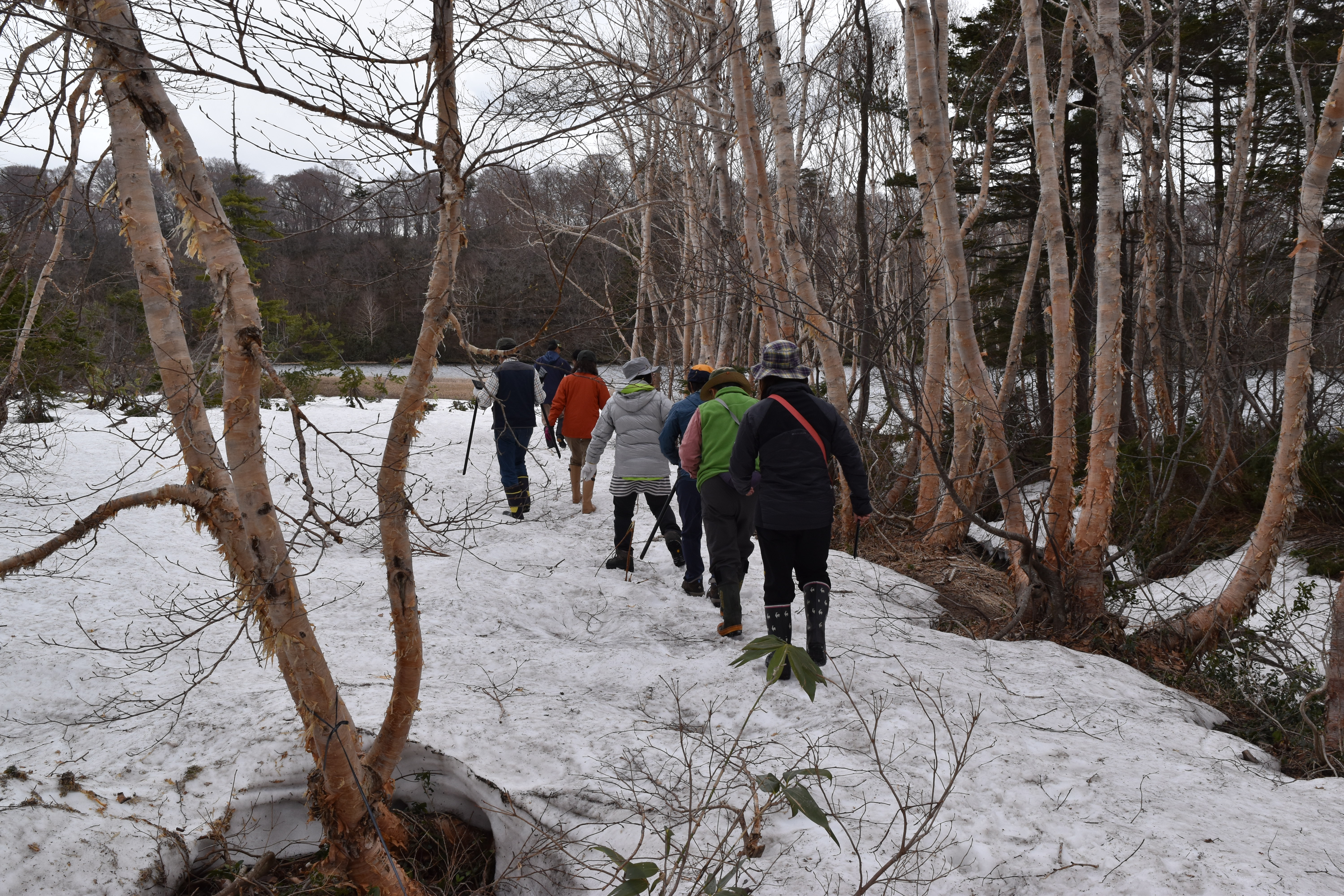 大沼自然研究路は1周約2km。残雪や雪解け水で滑る木道を、お目当ての樹木まで樹名板片手に歩きます。