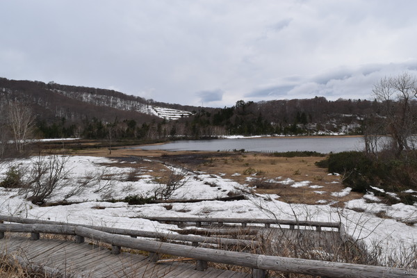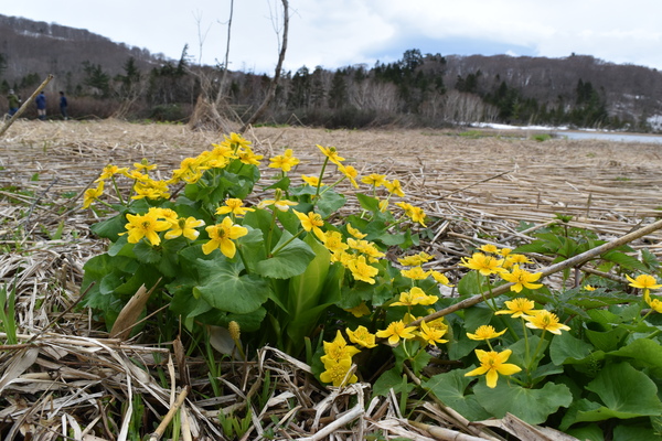 小脇には、ようやく顔を出し始めたミズバショウやエゾノリュウキンカが枯れたヨシ原を彩ります。