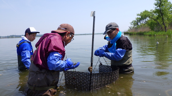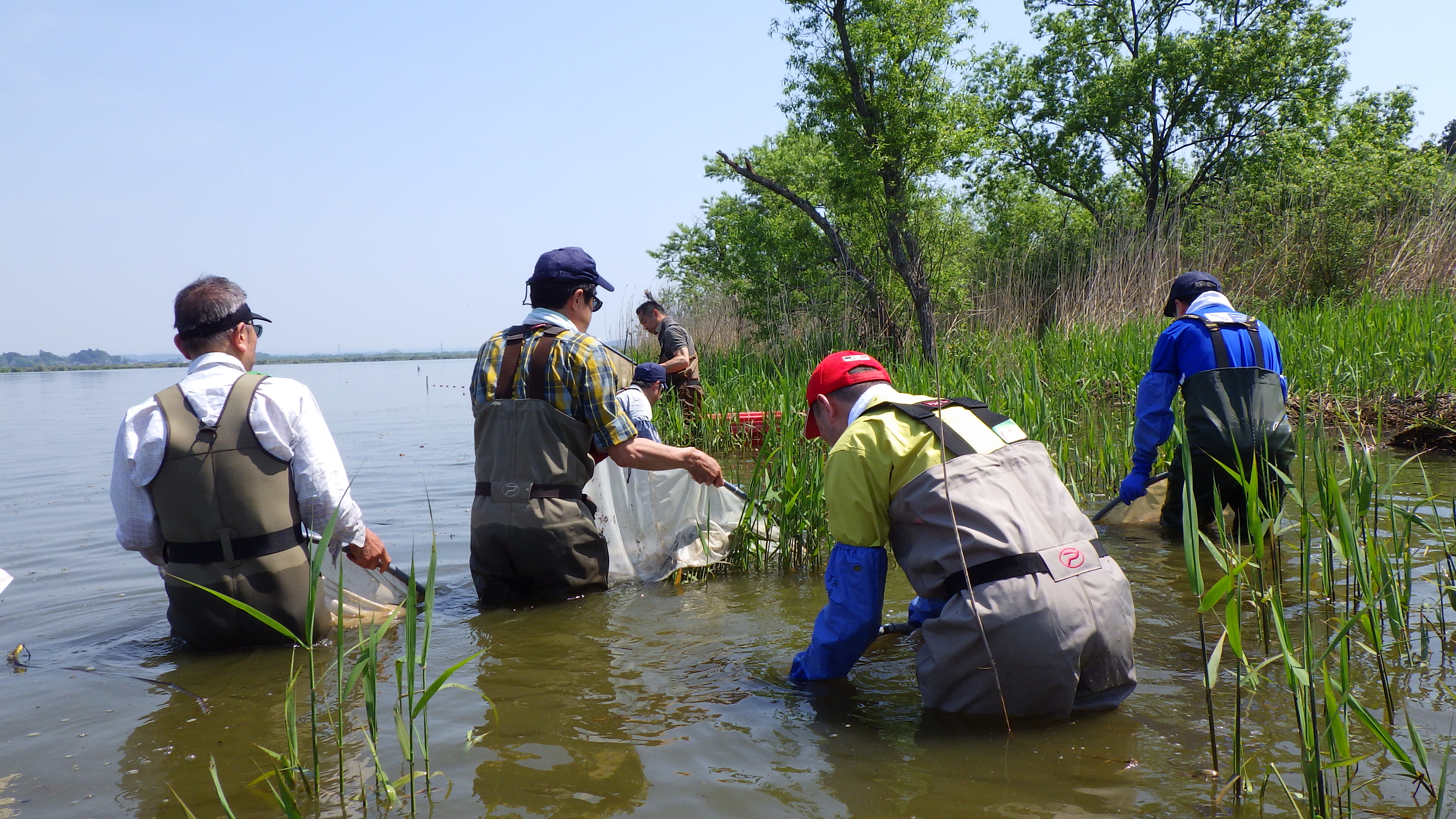 バス・バスターズは、伊豆沼・内沼の在来生物を脅かす存在である、ブラックバスやブルーギルを、ボランティアが集まって、人工産卵床に産み付けられた卵や、稚魚を三角網で掬うという地道な作業で駆除しています。