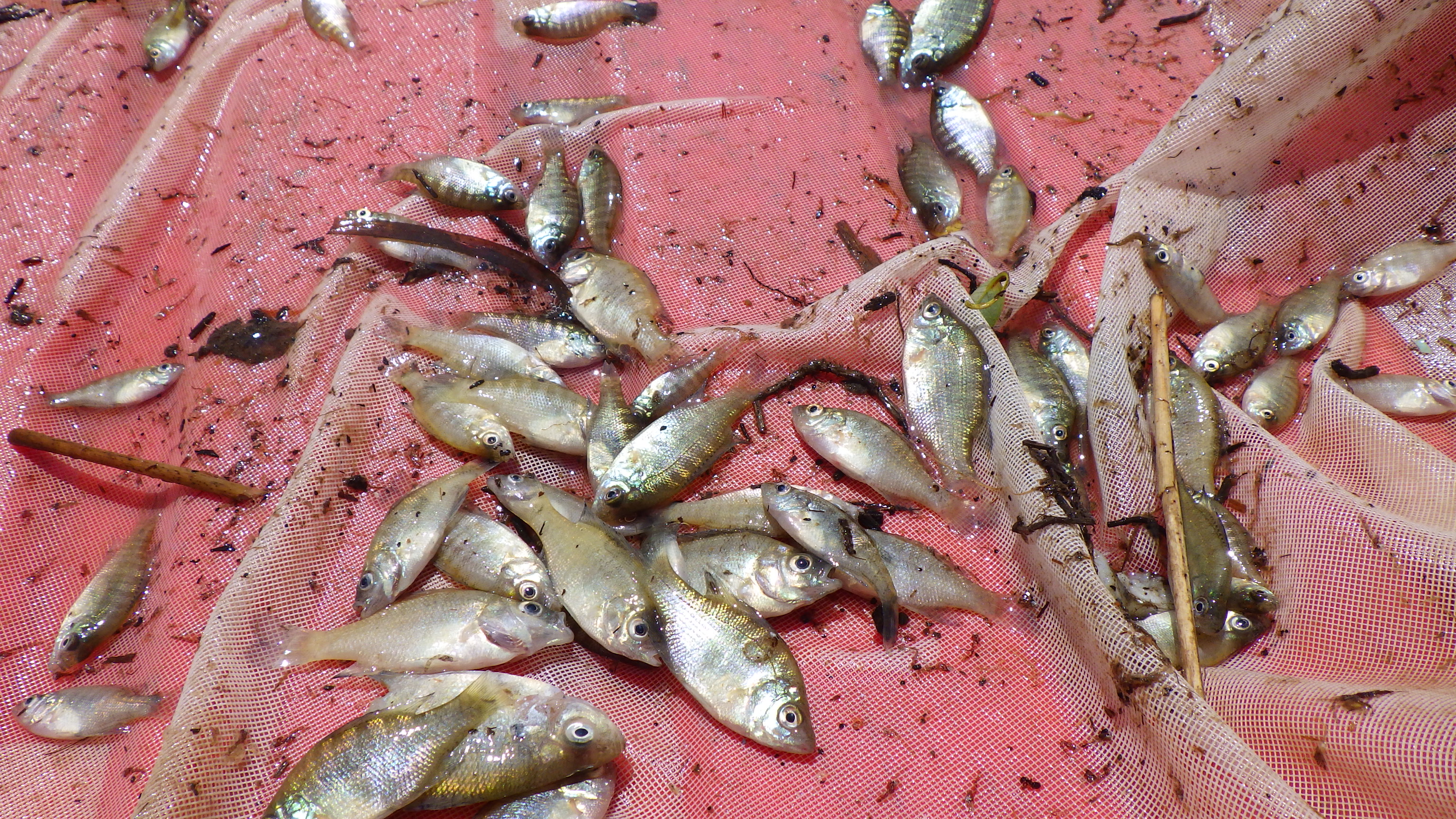 三角網で、稚魚掬いをしています。今回は、ブルーギルの稚魚が多く、三角網でヨシの繁みを挟み撃ちをすると、ブルーギルが網の中に入ってきます。多いといいながら、網に入る数は1度に1匹から10匹程度、これは昨年生まれた稚魚、大群での行動からバラバラでの行動になっているので、丁寧に探さなければ、網に入りません。