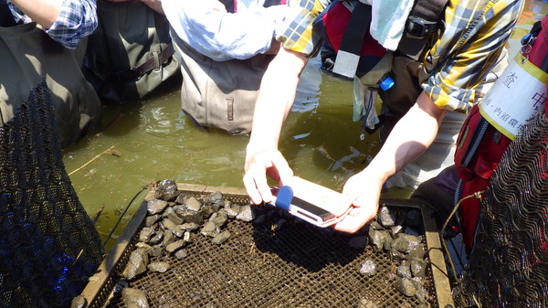 こちらの人工産卵床では、オオクチバスの産卵が確認されました。人工産卵床に敷き詰められた石が回りに寄せられ、中央部のメッシュ状の処に産卵してあります。二段式の産卵床の上部と下部に卵が見られました。産卵の確認はこの1基、開始当初からすれば本当に少なくなりました。今シーズンも、設置してある産卵床は100基、一つ一つ確認しています。これからも、卵、仔魚、稚魚、成魚段階に合わせた駆除活動が行われます。