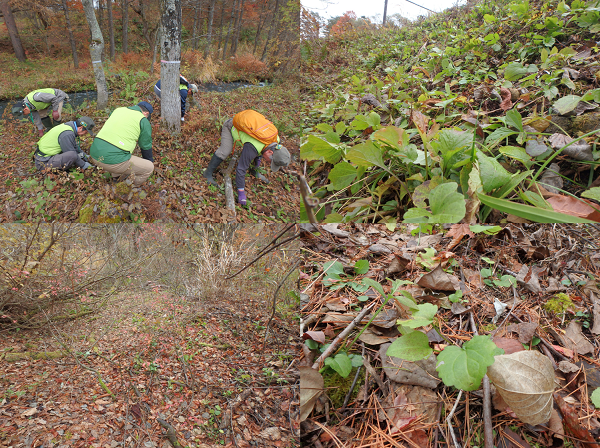 裏磐梯周辺では紅葉のピークも過ぎ、冬が間近に迫っているのを日に日に感じるようになってきました。今回はパークボランティアの方々と6月~9月にかけて五色沼周辺で行ってきた特定外来生物であるオオハンゴンソウの防除活動の成果確認と4月に設置した五色沼自然探勝路の植生保護のロープ回収作業を行いましたので、その様子をお伝えします。