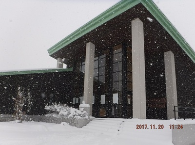 西目屋自然保護館事務所がある白神山地世界遺産センター西目屋館(以下、遺産センター)では、11月20日に初の大雪が降り、ご覧の通り真っ白になりました。