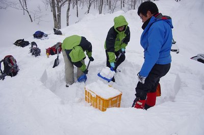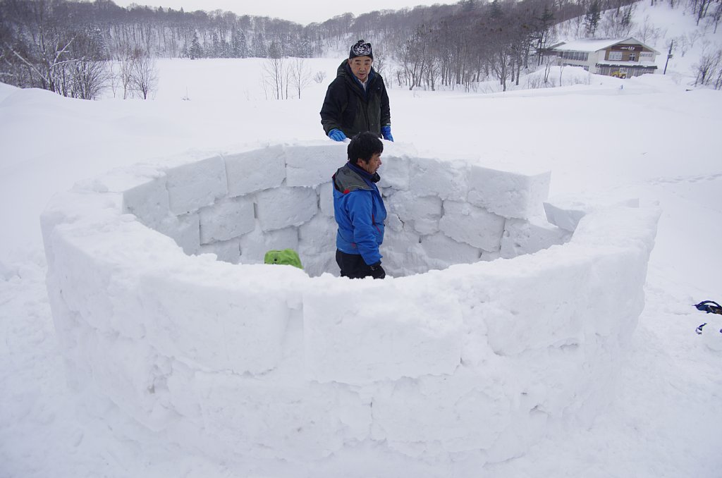 乾いたサラサラの雪は固まりにくいため、適度に湿った雪を探しながらブロックを作ります。上手くドーム状に積み上げていく前に雪質を選ぶことから始まるようです。