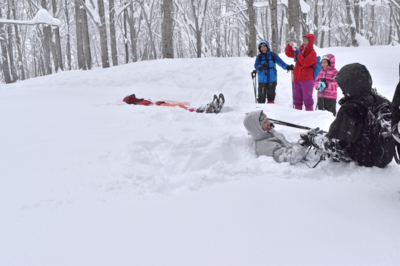 ですが、開けたところで倒れ込んで人型を作ってみたり、スノーシューの足跡で絵を描いたりして、たくさんの「雪」を楽しんでいました。
