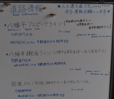 当日、八幡平ビジターセンターの玄関口に掲載されている道路情報を見てみると、どうやら10時から冬期通行止め解除予定、とのこと。