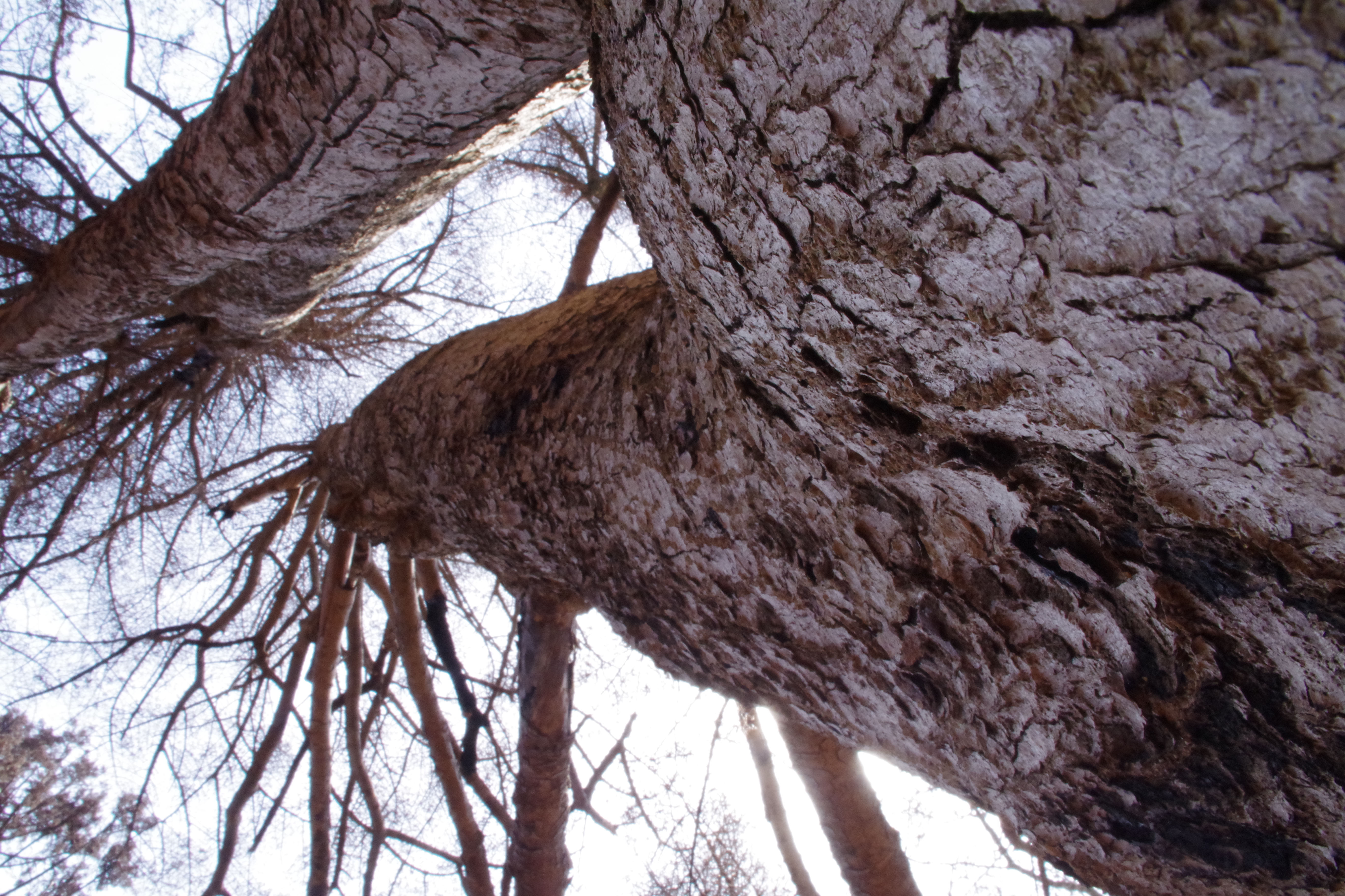 幹が黒くなっていない、火が回らなかったと見られるモミの大木ですが、緑の葉はついていません。