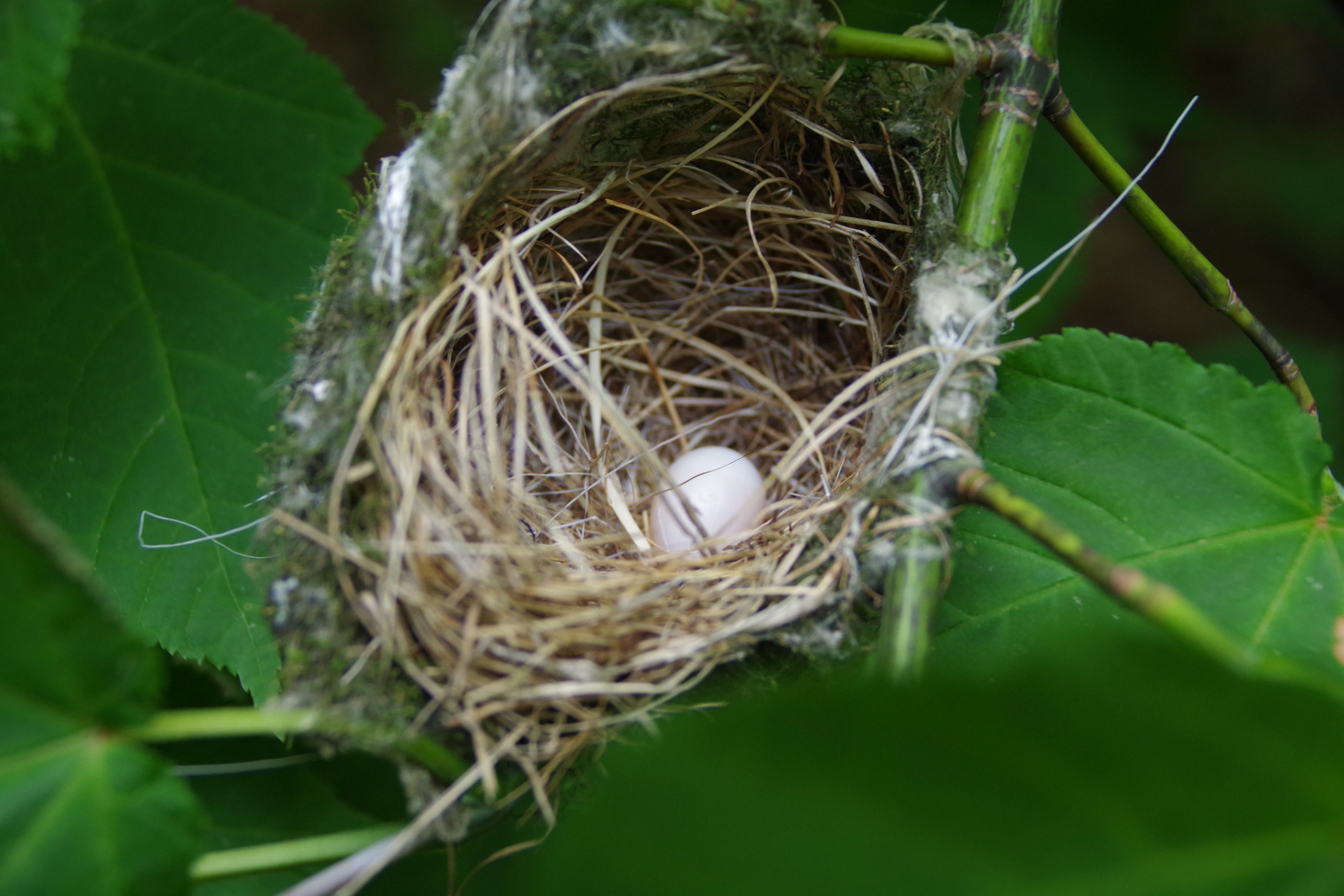 枝を引っ張って上部をのぞいてみたら中には親指の爪の大きさほどの小さな鳥の卵が。