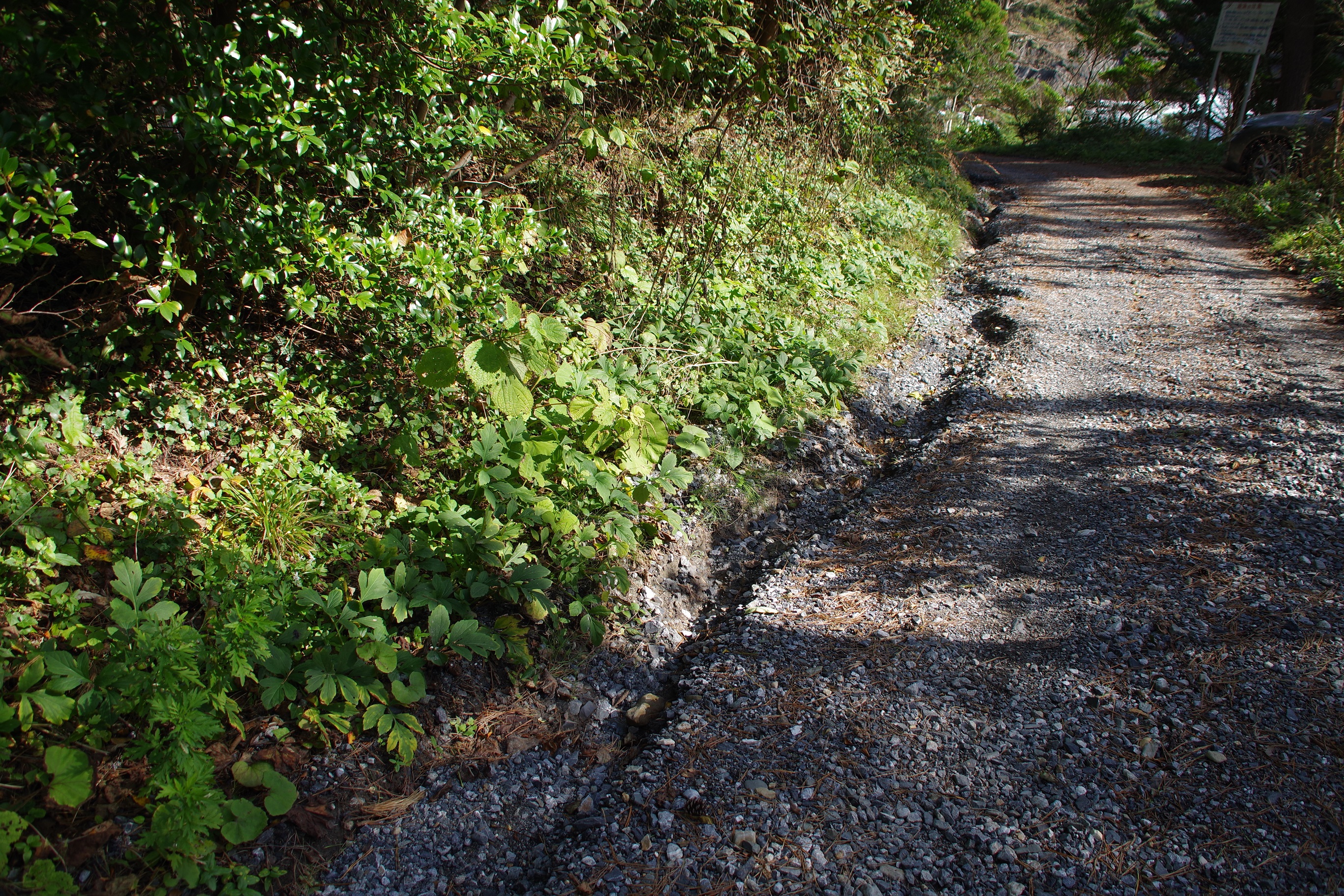碁石海岸地域で確認されている生育範囲は大浜(おおはま)へのアクセス路である砂利車道の両脇、