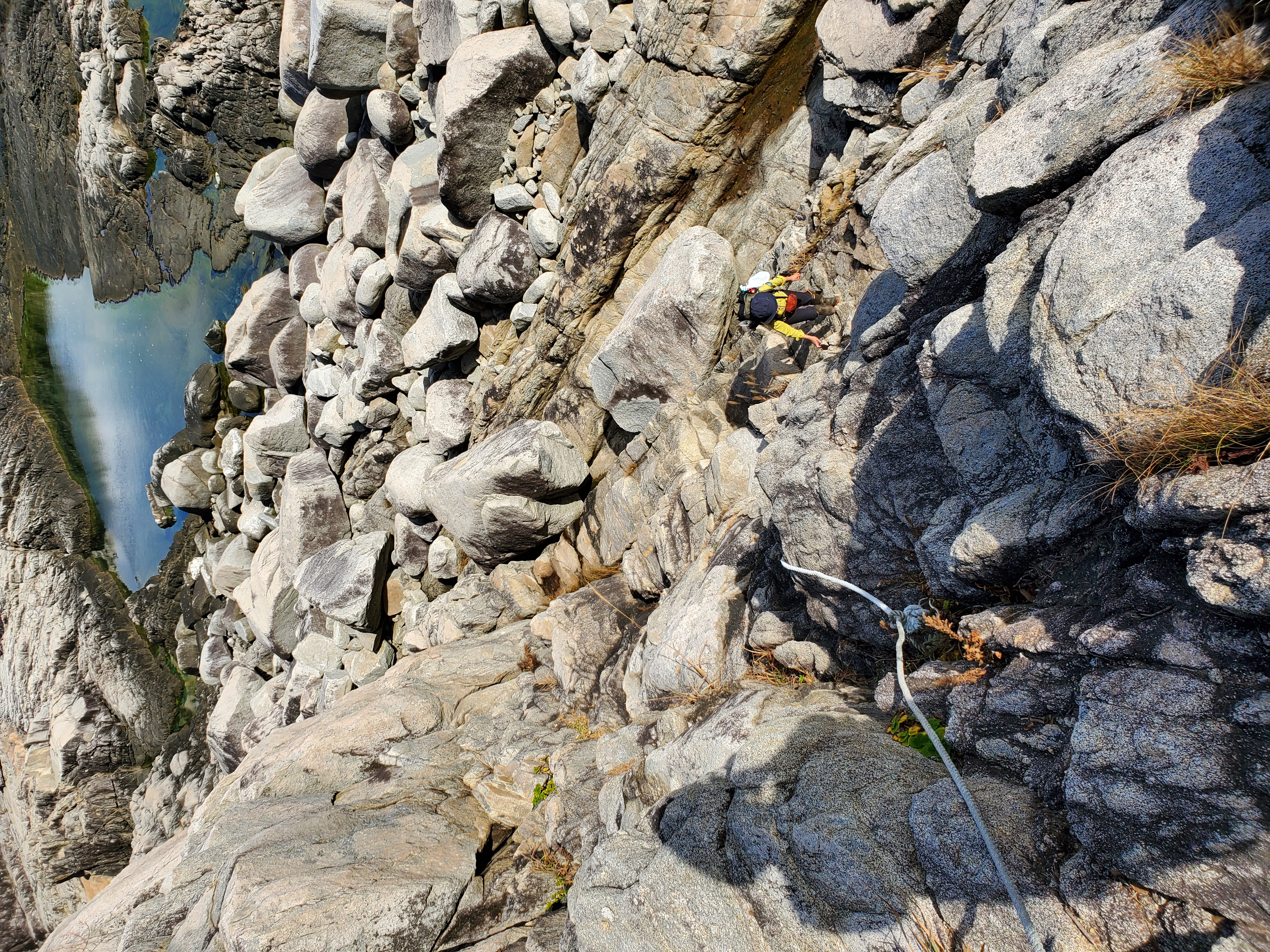 この千畳敷に降りるためには、ロープを使って岩の壁と闘います。