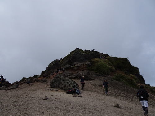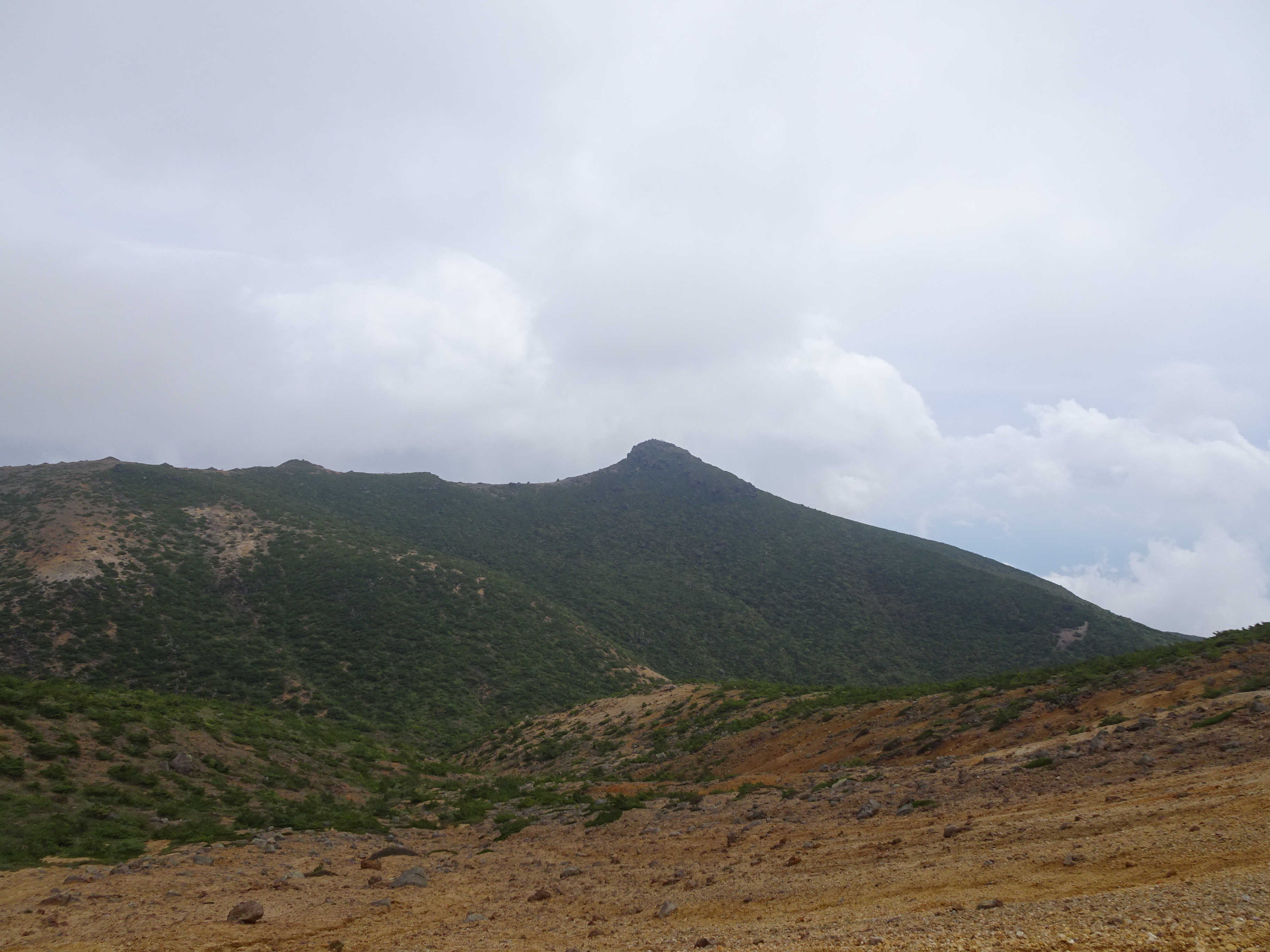 無事に安達太良山の山頂に立ち(ロープウェイ方面からの登山者が多かったです)、山に御挨拶した後は、先ほど歩いた稜線を向こうに見ながら鉄山に向かいました。
