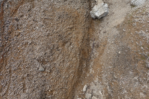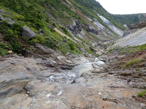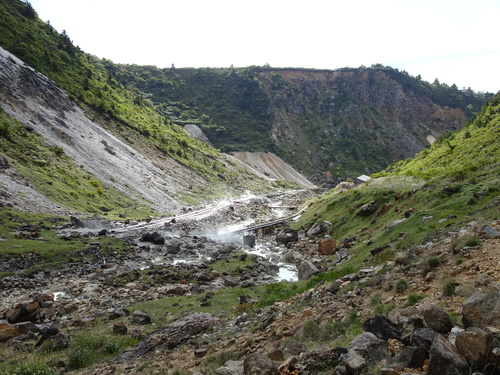さらには、至る所から少しずつ水が集まり、川になっていく様子を歩きながら感じることができました。川の途中には源泉と湯の花採取場が見られ、活火山であることと、ここから人の生活と結びついていることが実感できました。