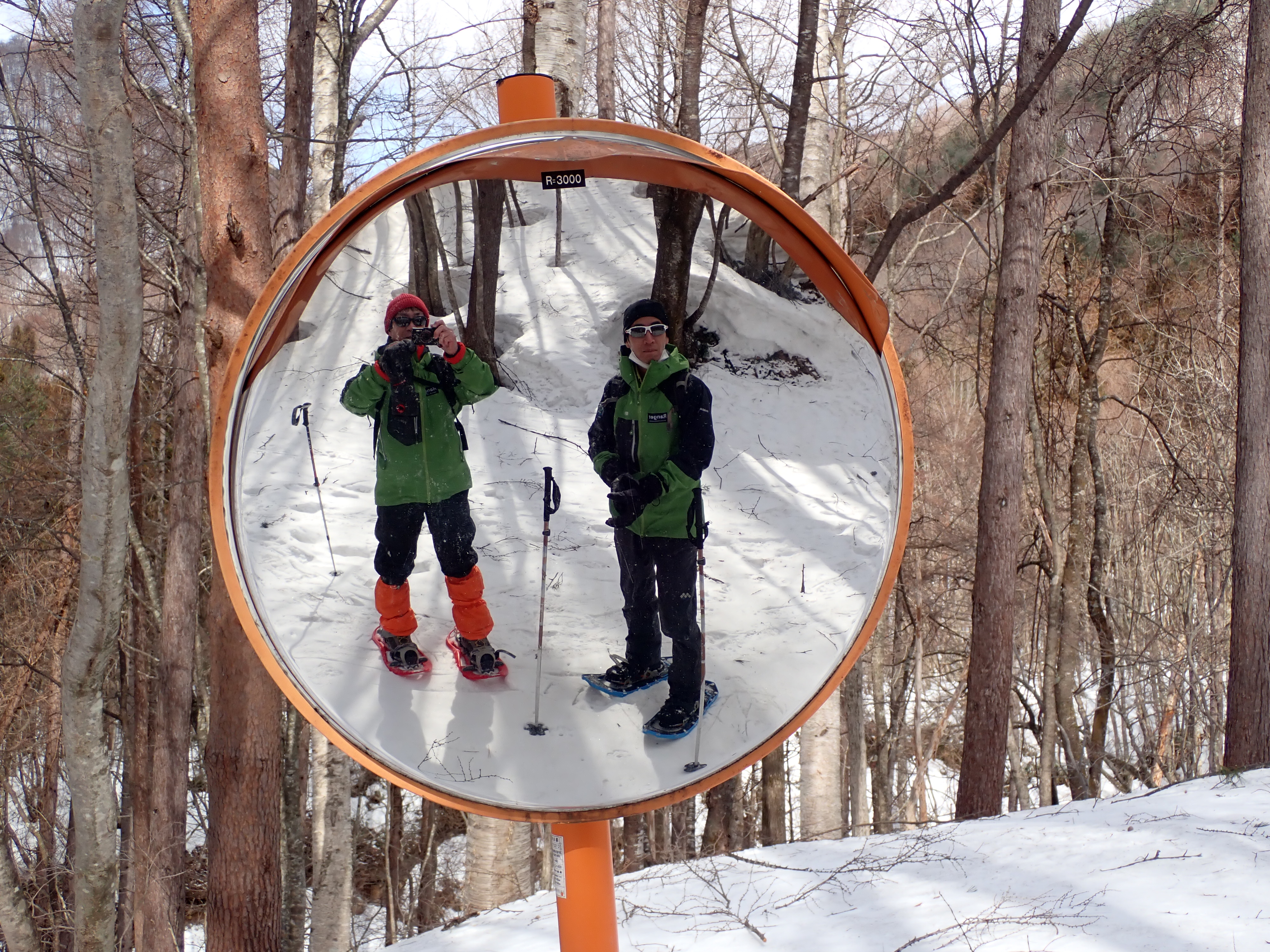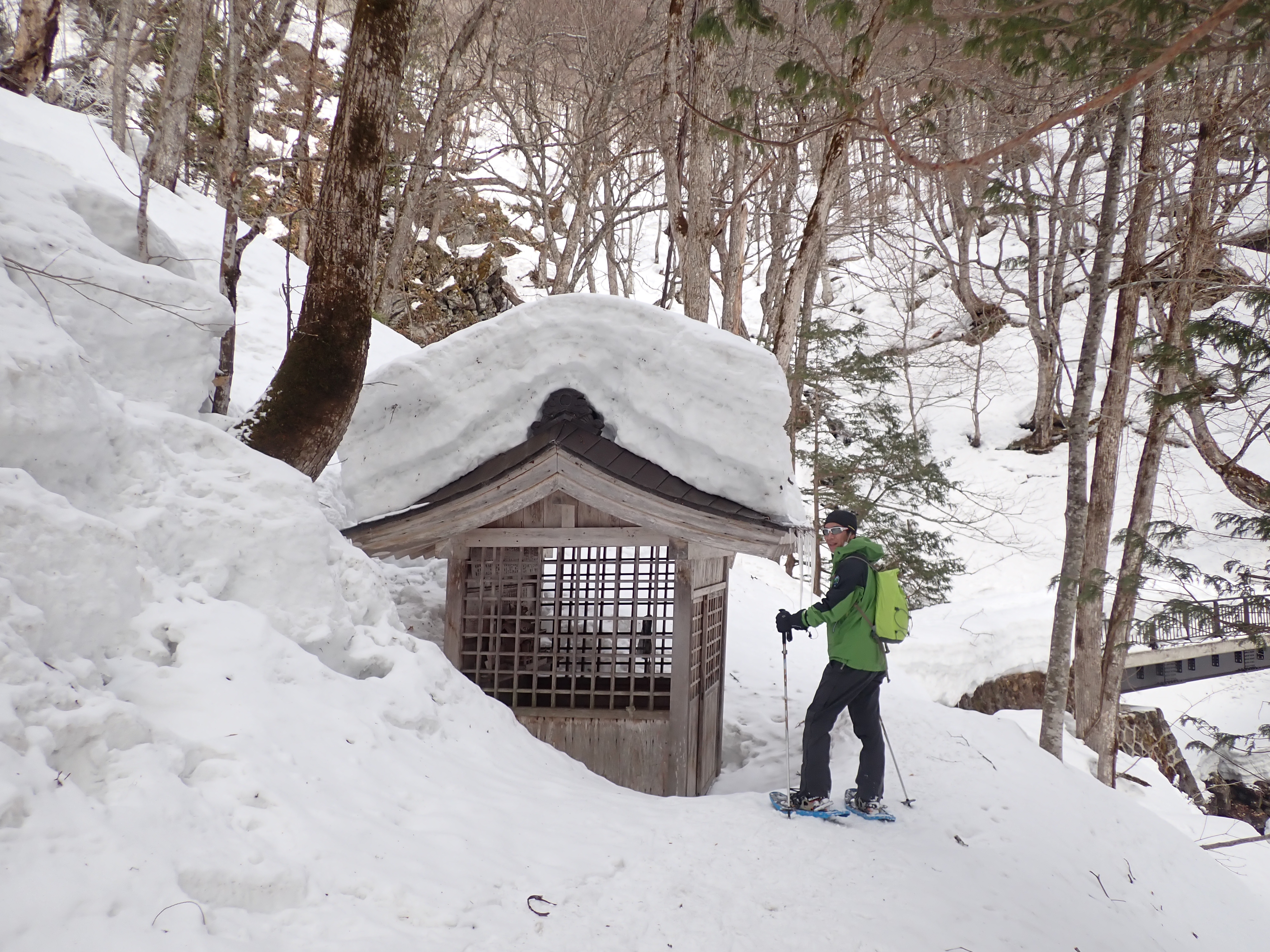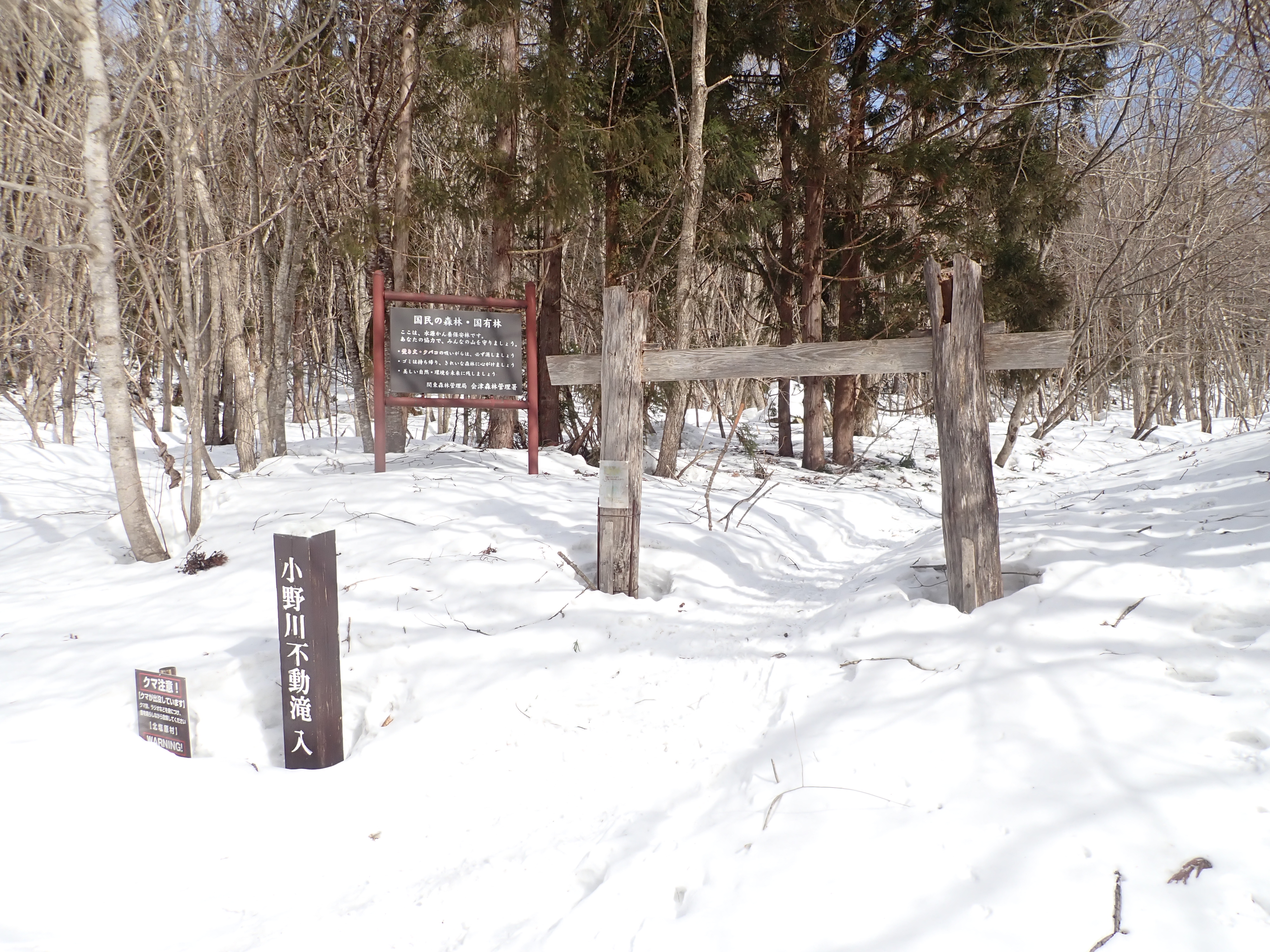雪のない時期は、滝に向かう探勝路(参道)のすぐ前に駐車場がありますが、今回は雪のため車で行くことができませんでした。近くに車を止め、スノーシューで目的地まで向かいました。