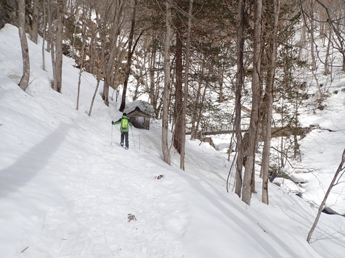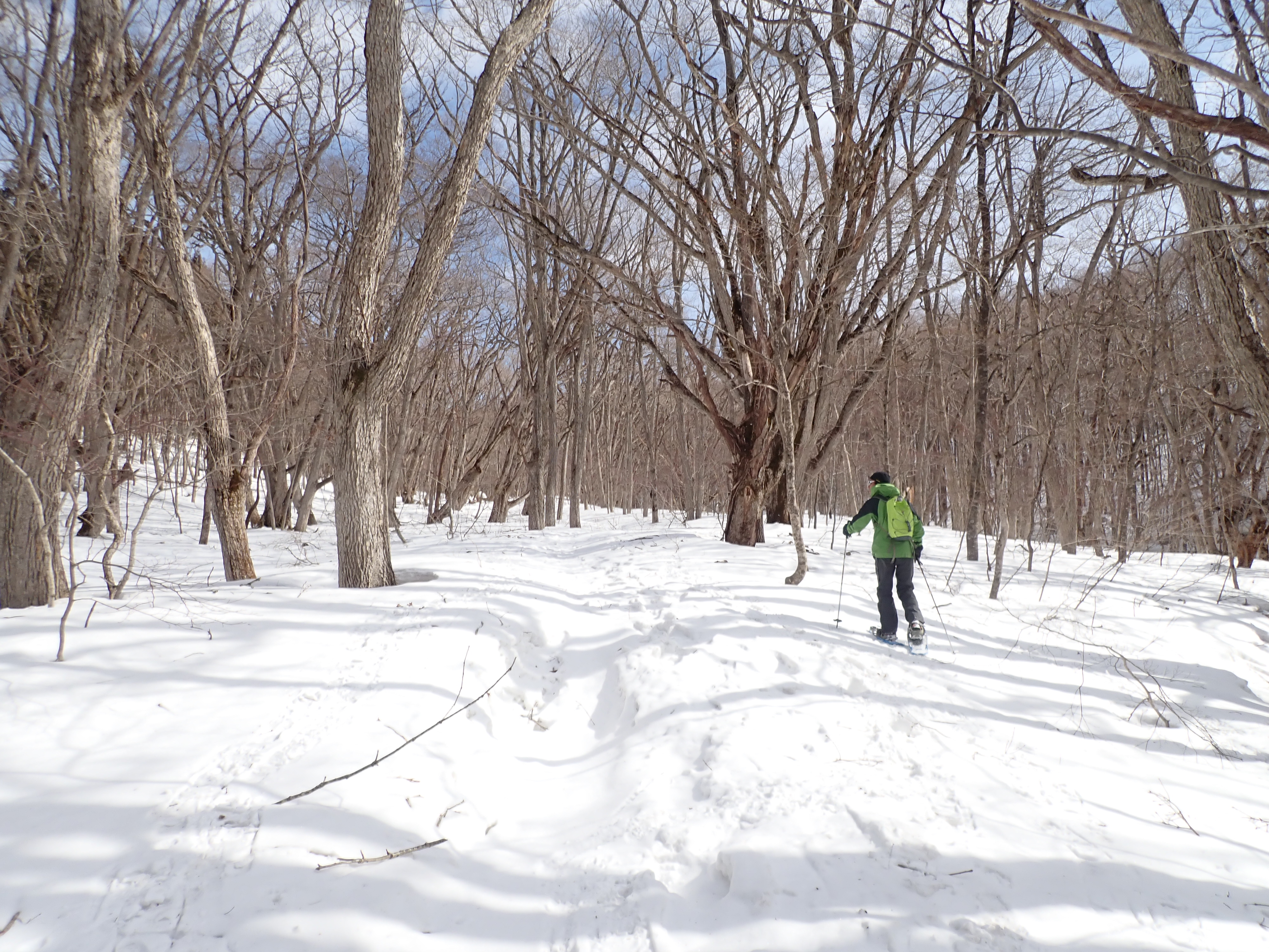 ただ、スノーシューのトレース(疑わずにたどっていくとルートからはずれてしまうことがあるので注意)が幾つかあったことと、方角は分かっていたので、迷うことなく歩みを進められました。思った程雪はなく、また風の影響による倒木等も見られませんでした(枝等はたくさん落ちていましたが)。
