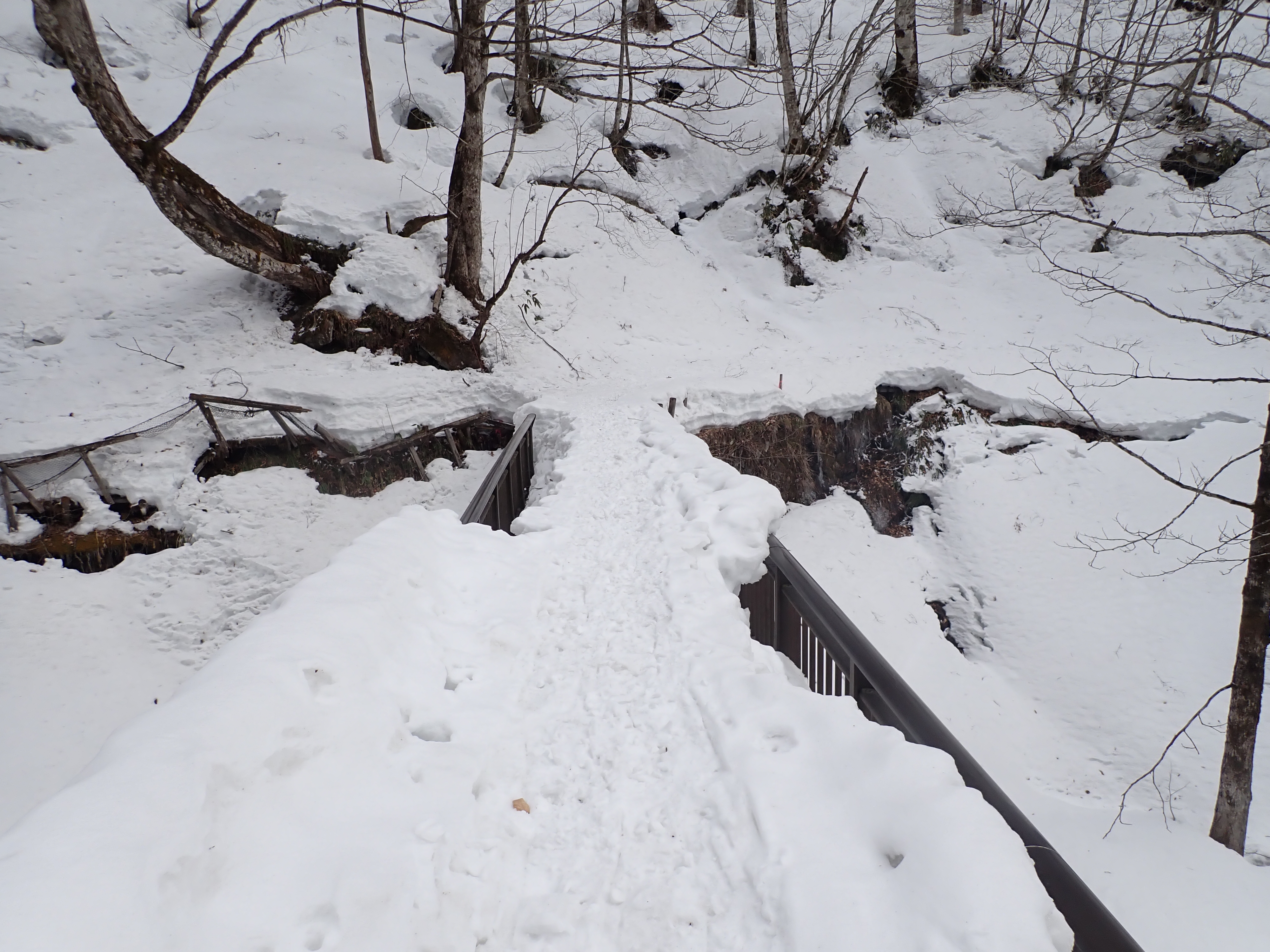 道路(ガードレール)や探勝路入口にある鳥居などは目印となり歩きやすいのですが、その鳥居を過ぎると夏場に見えていた探勝路はほとんど分かりませんでした。