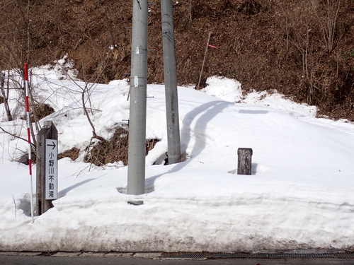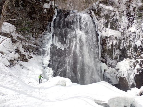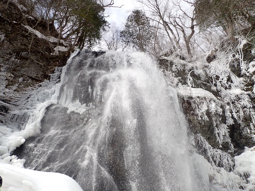 気をつけながら進み、滝の方に目を向けてみると雪に囲まれた小野川不動滝が。