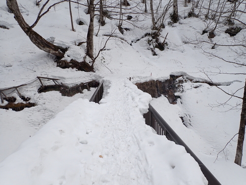 滝を正面から見ることができる橋も欄干の高さを超えたところまで雪が。これは結構な危険度です。