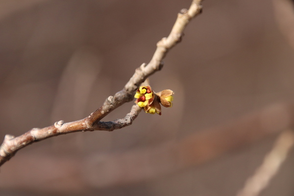 〈春はまだですか?と顔をのぞかせているマンサク:くるくるの花弁を控えめに広げています〉
