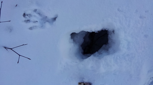 〈誰の足跡でしょう?:湖畔に下りて踏み抜いた私の足と手の跡です〉