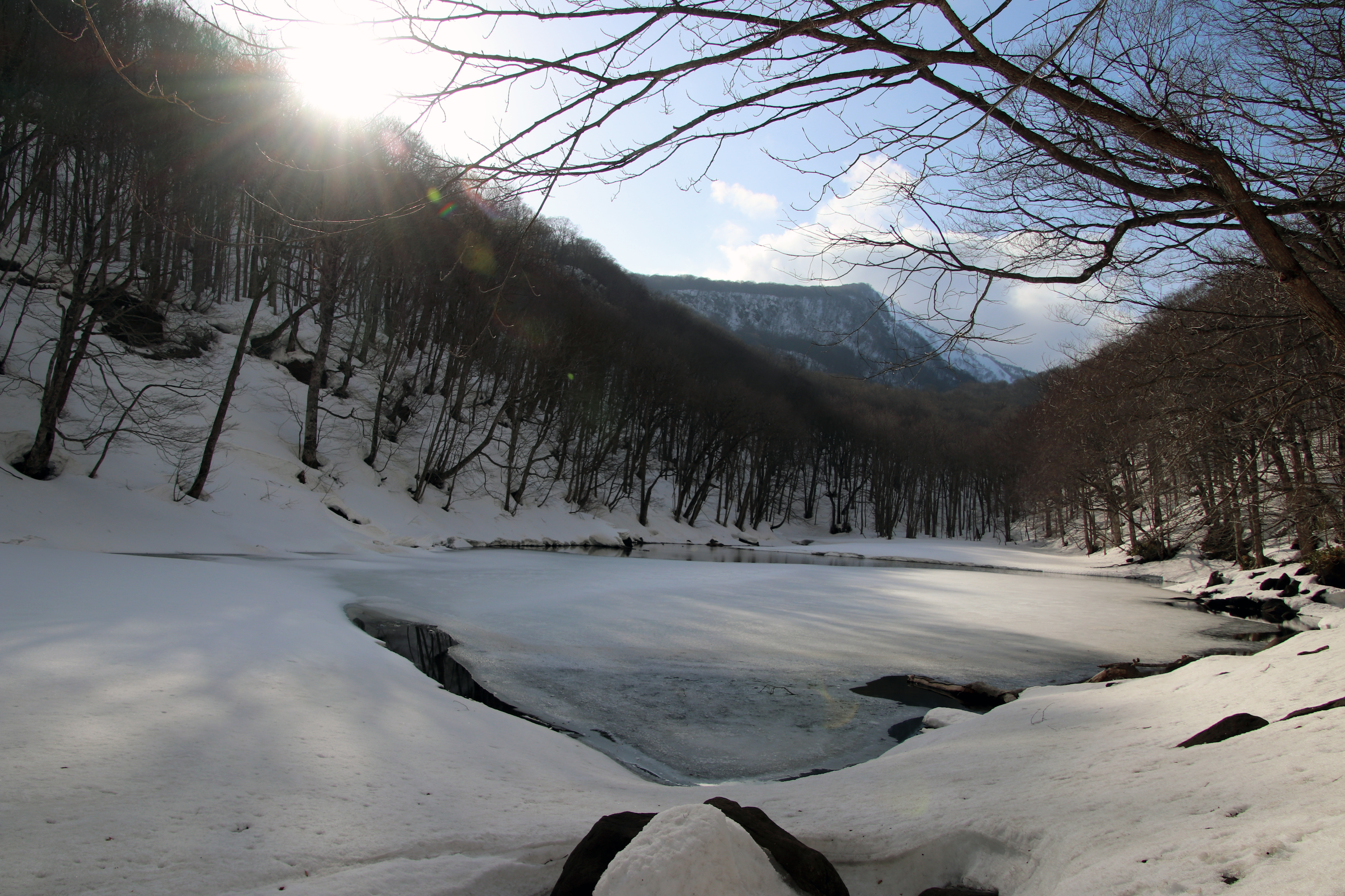 紅葉の時期の朝焼けの風景が有名な蔦沼ですが、積雪期もまた趣があります。