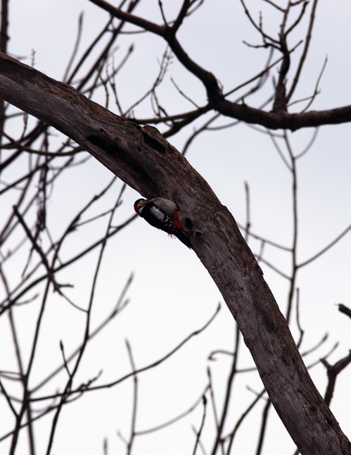 桐の大木の枯れ枝をつつき、自己アピールしているようです。