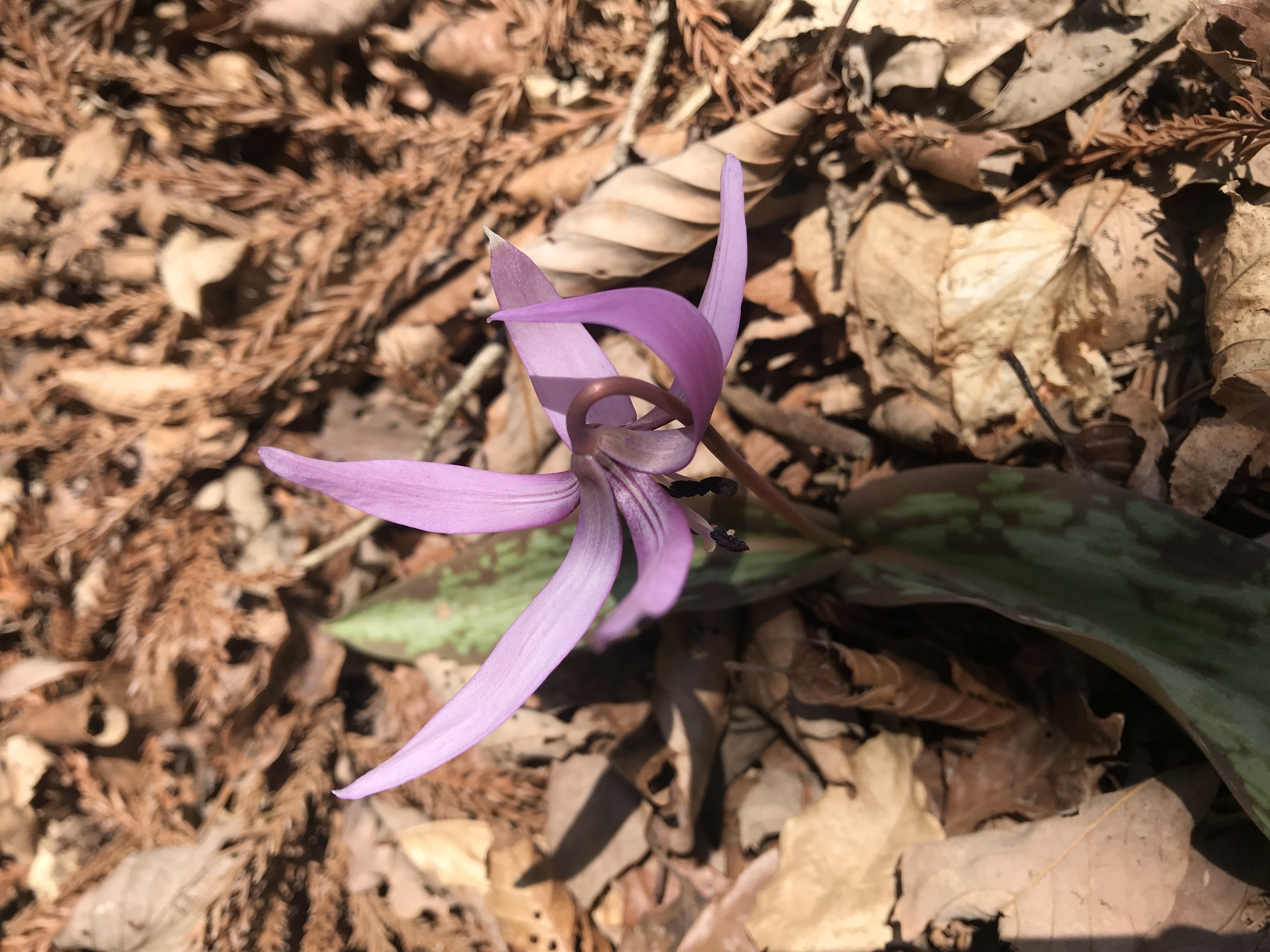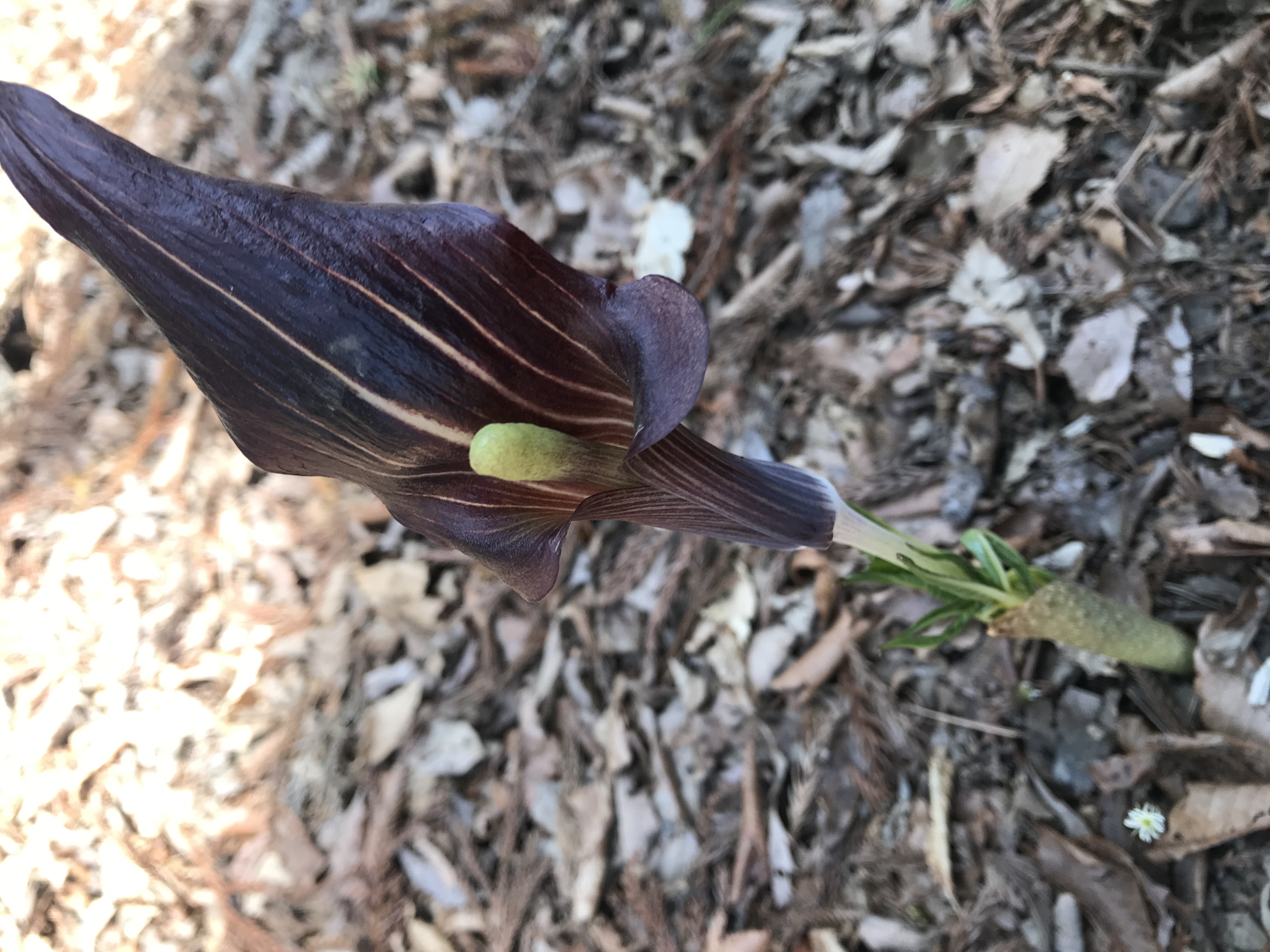 暖かくなってきて、みちのく潮風トレイル女川・牡鹿方面の林道ルート内でもミミガタテンナンショウ(マムシグサの一種)やカタクリの群生があちこちで見られるようになってきました。