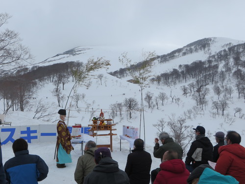 月山スキー場開きの式典が始まりました。神主さんの儀式に、静かに耳を傾けます。