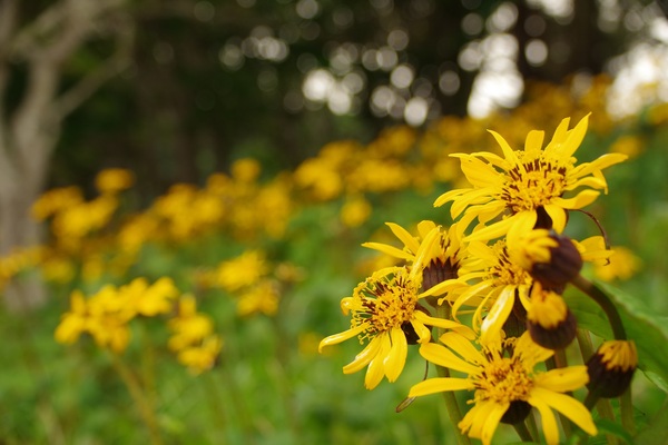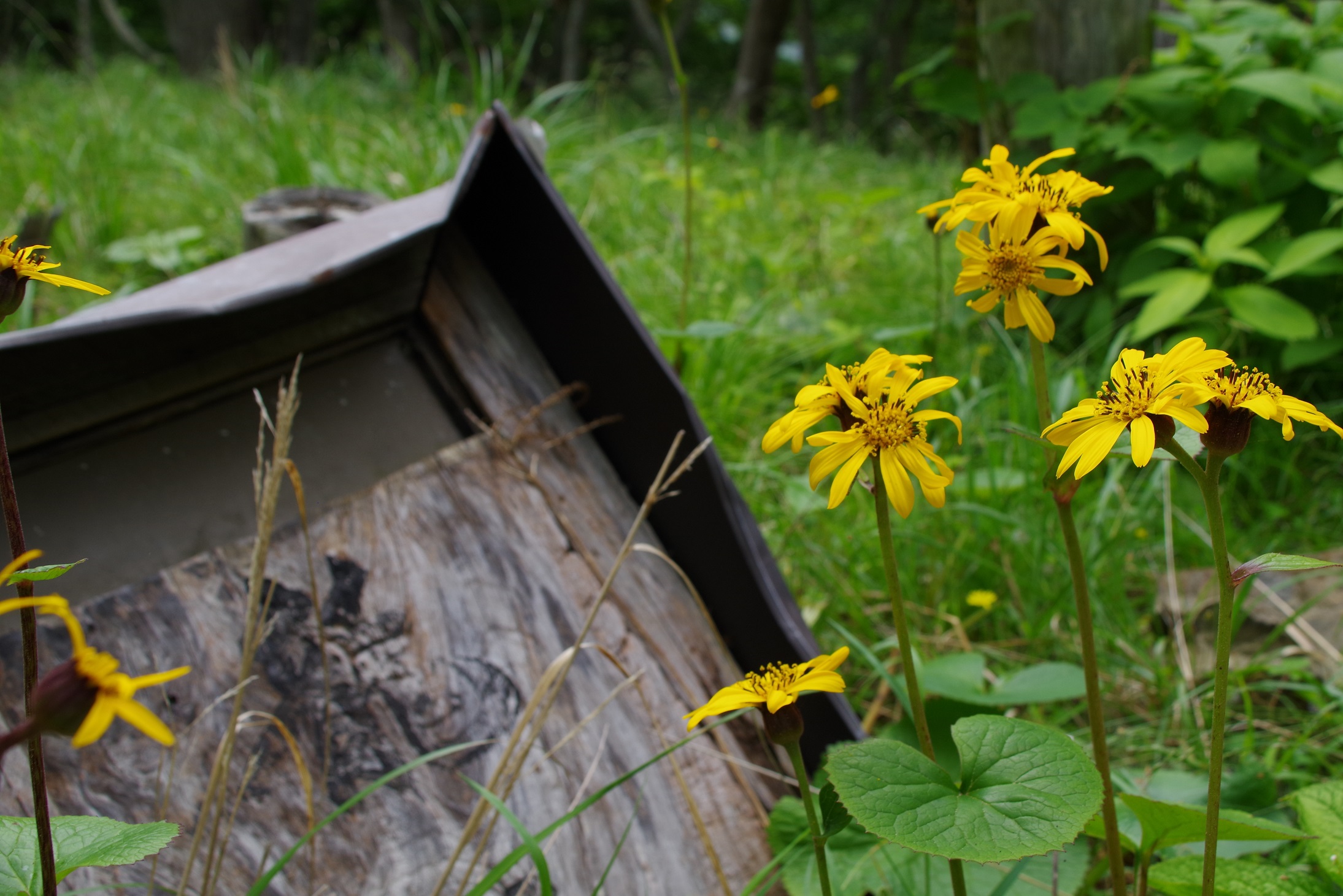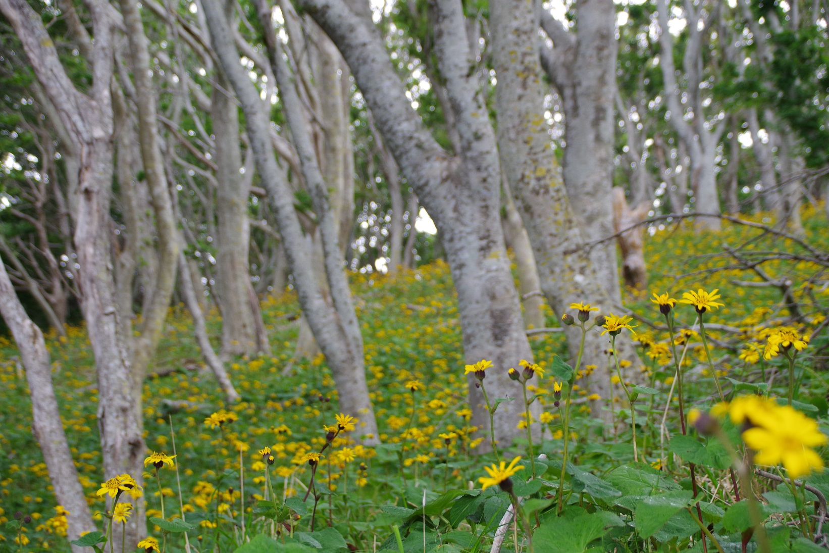 今年のマルバダケブキはニホンジカによる葉の食害が目立ちました。この辺は例年ですとマルバダケブキは食べられる対象ではないのですが、シカ界の食糧難なのか好みの変化なのでしょうか。勢いよく育つと花茎が1メートルほどにもなるこの花ですが、背の高いものが少ないなという印象でした。