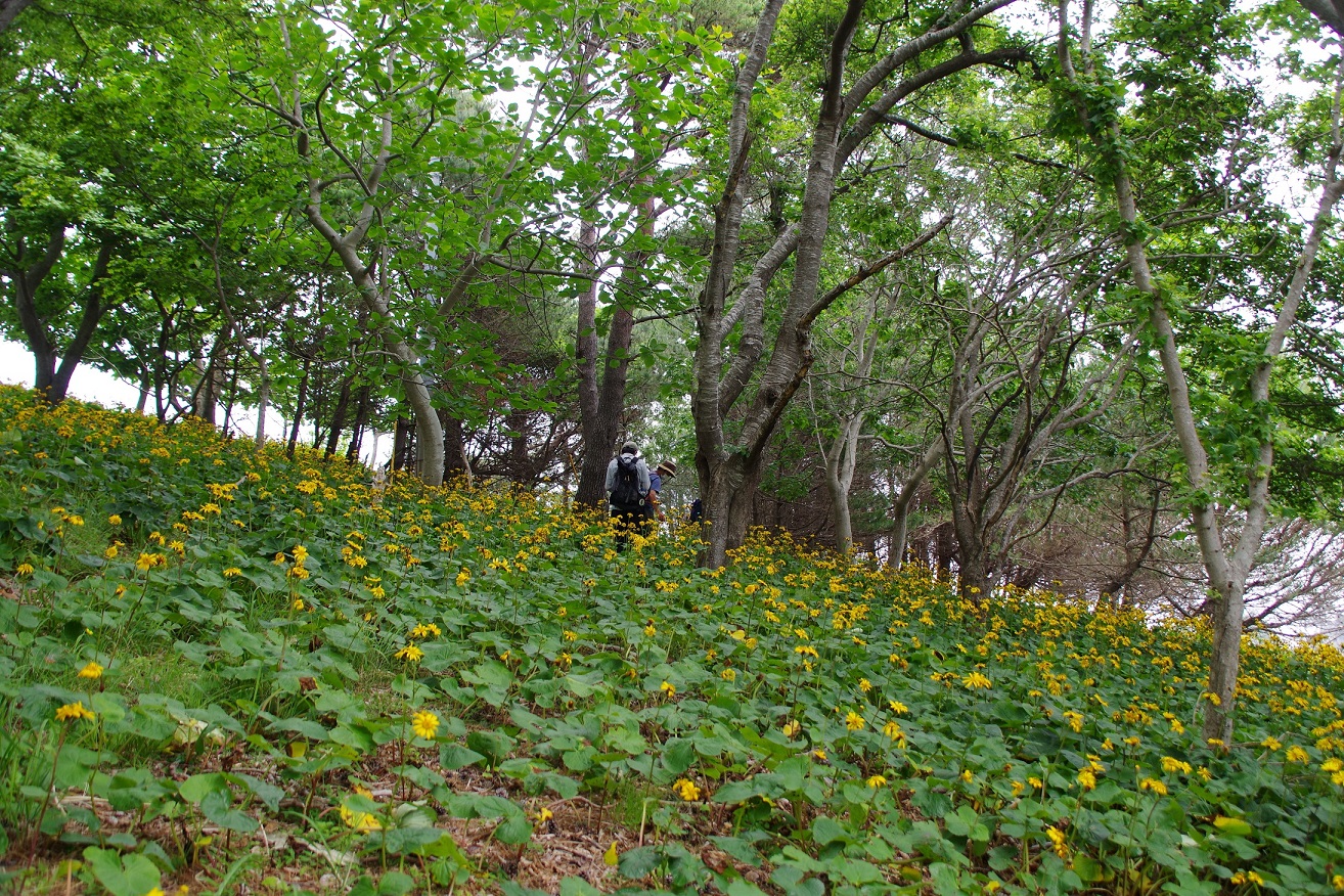 今年もこの時期、三陸復興国立公園で指定植物になっているマルバダケブキや海浜植物をはじめとする自然環境調査を目的に大船渡市首崎へ行ってきました。この日はあいにく鈍色の空で、気温は高くじめっとする気候でしたが、岬先端では心地よい潮風が湿気を払ってくれました。