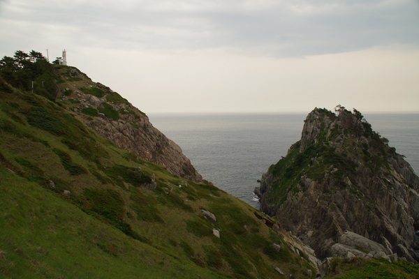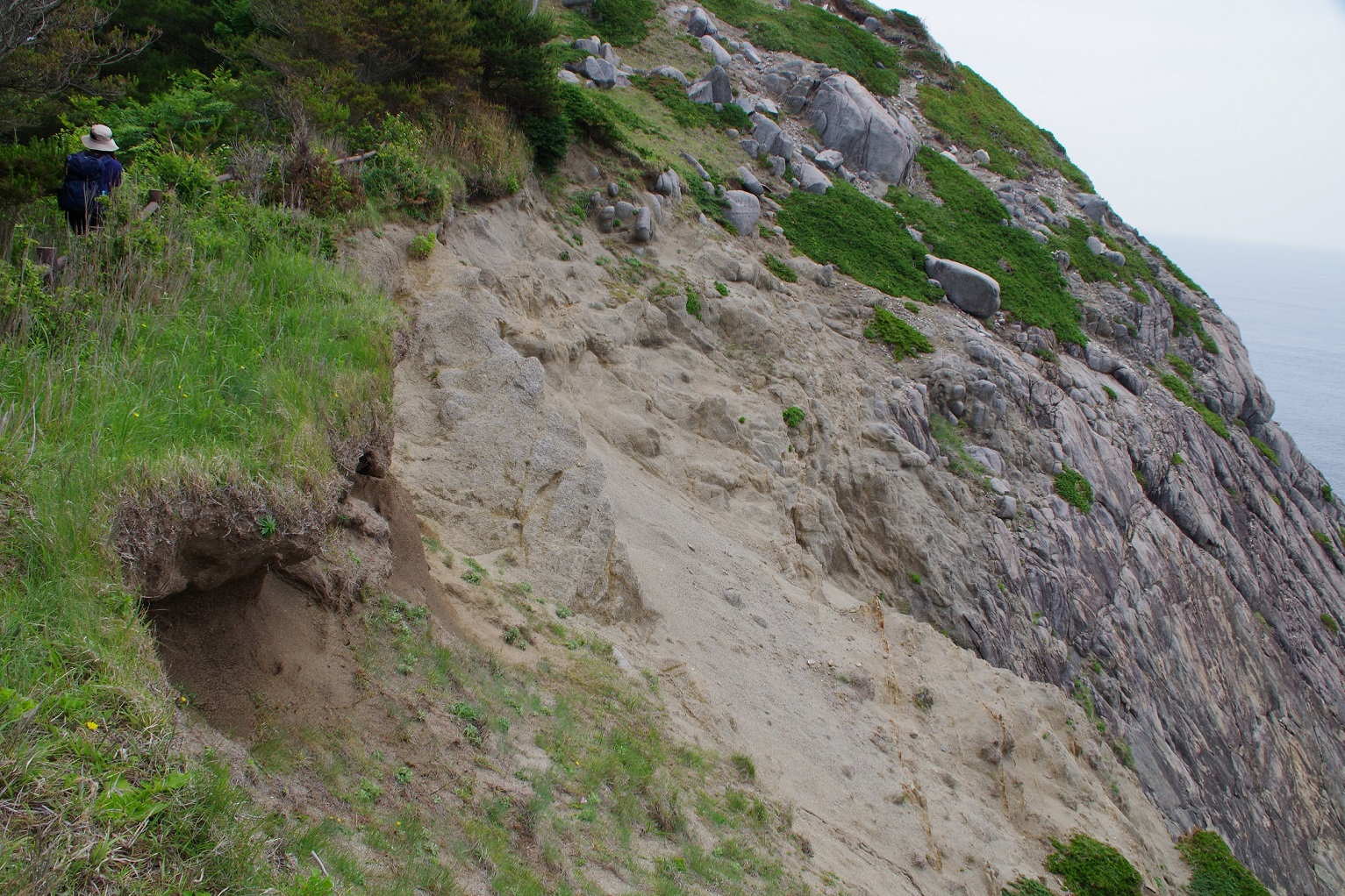 さて首埼灯台のある岬先端へと歩みを進めます。先端に向かって馬の背の部分を歩いて行くわけですが、南側斜面はボロボロと激しく崩れています。あと数年で通っている上の歩道も崩れてしまいそうです。