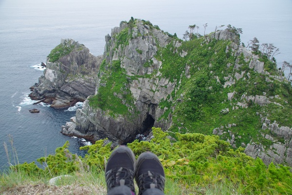 半島先端まで到着し、観察・調査も一段落。お昼ご飯を頬ばっているときです。目の前の崖に気になる黒い鳥が見えました。海抜101メートルの場所に私は座っています。感覚が伝わるよう足を写して下に見える島を撮影してみました。